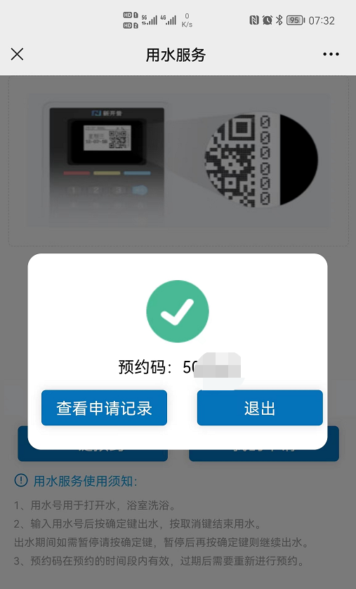 用户可在此领取用水服务预约码,点击“一键预约”后即可生成6位随机预约码,可凭此码在浴室,开水房等场所进行无卡消费,消费金额将从校园卡账户中进行扣除。