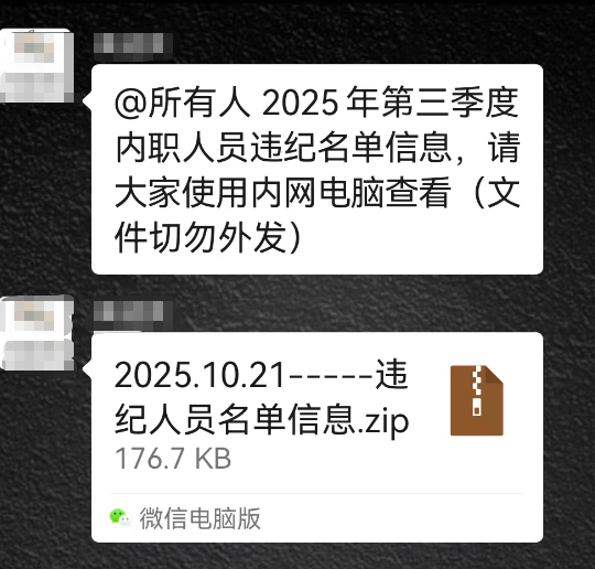 根据网络安全机构统计,仅今年9月就捕获到该病毒400余个新变种。其典型传播方式为:伪装成“2025年第三季度在职人员违纪名单”等名称的压缩文件,通过电子邮件、钉钉、企业微信及微信群等渠道广泛传播,诱导用户点击。一旦运行,病毒将静默植入并自动升级,具有较强的免杀能力,目前已有部分高校用户受到影响。